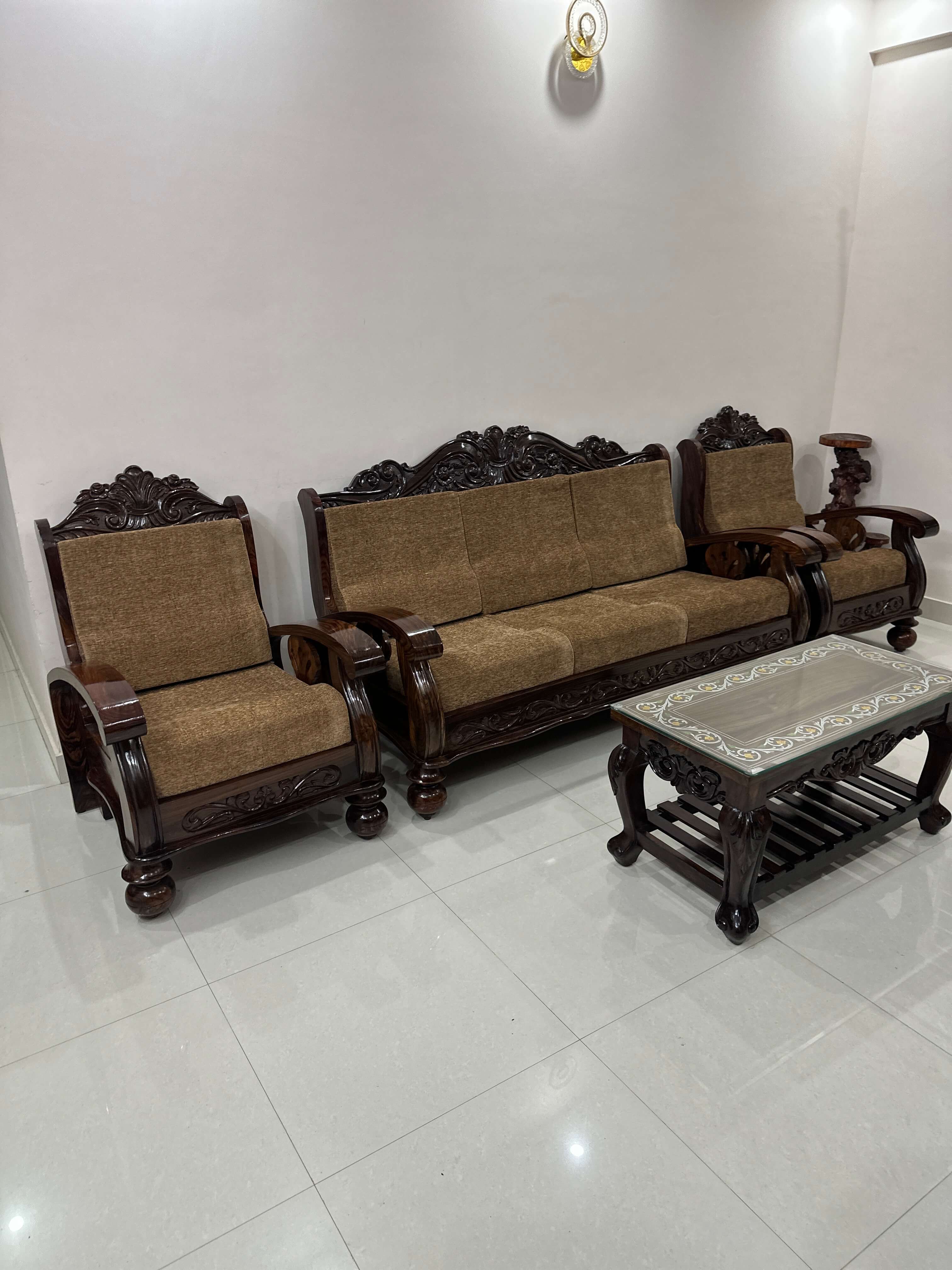 This elegant rosewood sofa set features a three-seater and two single chairs, each meticulously hand-carved with floral and scroll motifs. The rich dark wood finish complements the warm brown upholstery, offering a regal yet cozy seating experience. The matching coffee table with a glass top and decorative inlay completes the ensemble, making it ideal for formal living rooms or heritage-themed interiors. Crafted by skilled artisans, this set is a testament to traditional Indian woodworking and timeless design.