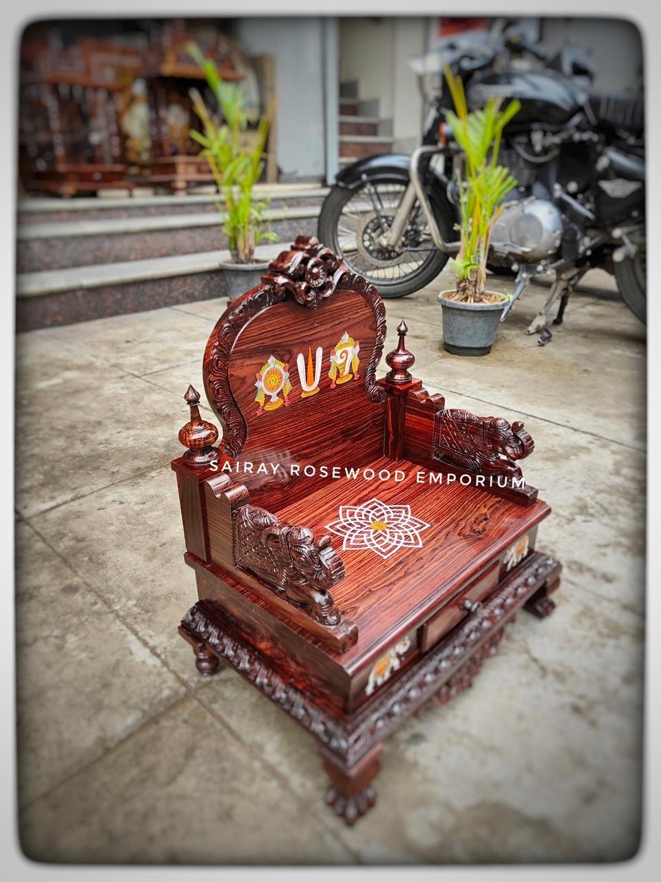 A premium solid rosewood pooja chowki featuring a high, carved arched back panel with sacred symbols, deeply carved side arm panels, and a thick stepped platform. The front fascia houses smooth‑glide storage drawers for incense, camphor, diya wicks, and matchbox. Robust carved legs and an intricately worked apron ensure stability and visual richness. The seat includes a central rangoli‑style motif and protective raised edges. Finished by hand to highlight the rich rosewood grain. Ideal for home mandirs and festive rituals; designed for daily use with practical storage