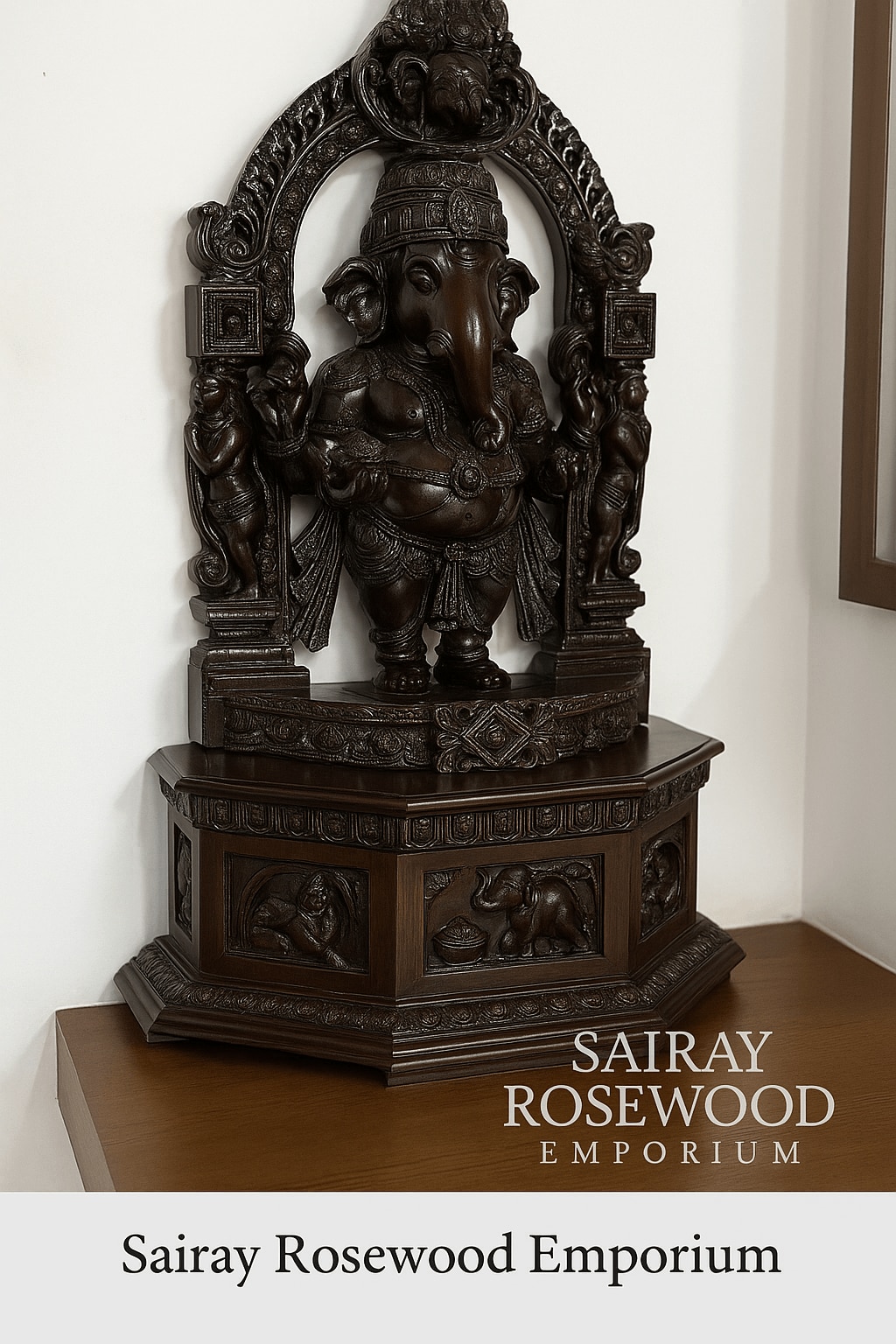 Experience divine grace with this hand-carved Lord Ganesha idol, prominently featured within a hexagonal base and adorned by an ornate archway. Meticulously crafted from premium dark polished wood (likely rosewood), this masterpiece reflects exquisite Indian artistry—from the deity's detailed trunk and ornaments to the intricate patterns on the arch. Ideal for home temples and elegant interiors, it adds depth, spirituality, and tradition anywhere it is displayed.
