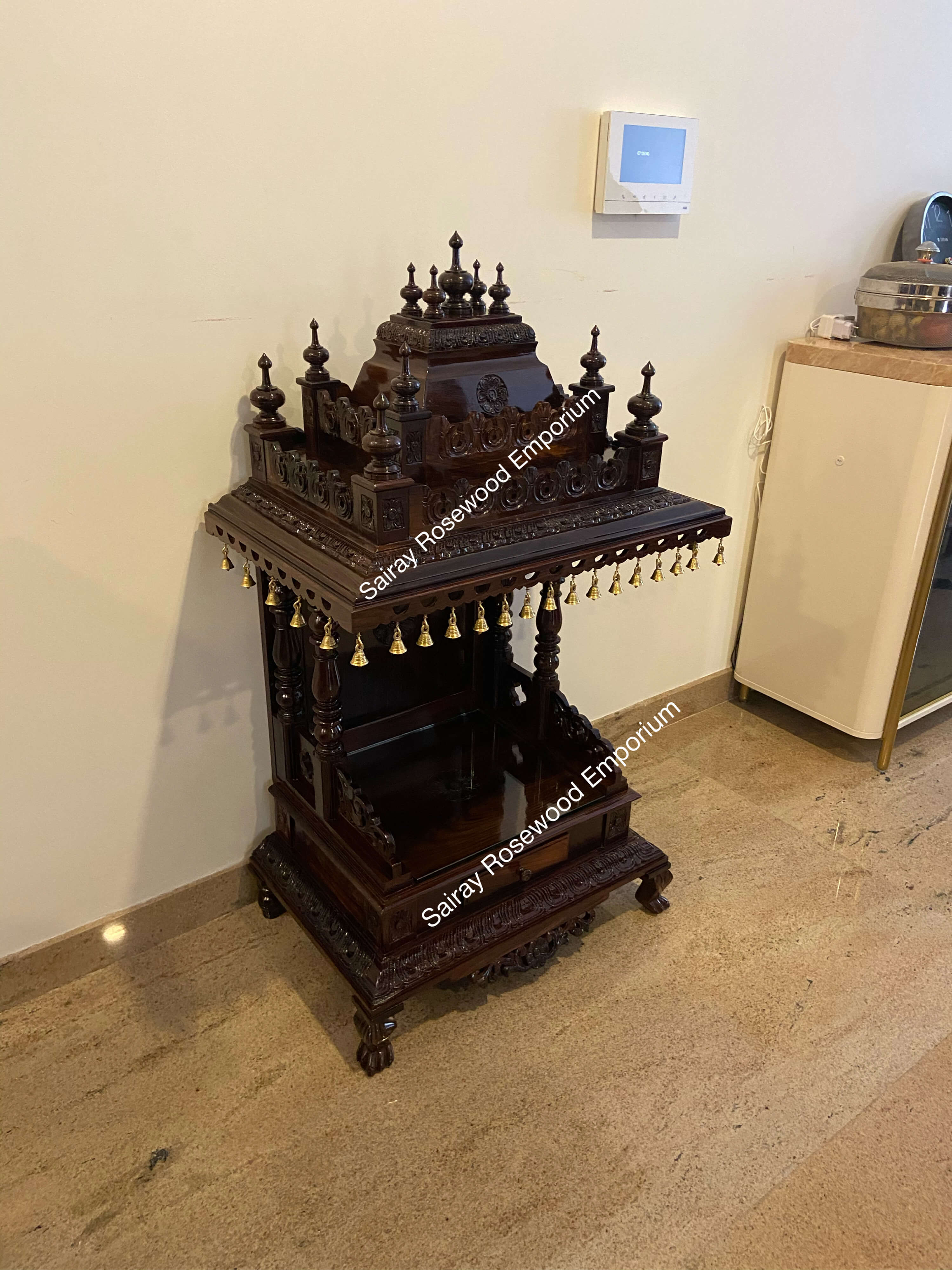 Experience divine grace with this hand-carved Lord Ganesha idol, prominently featured within a hexagonal base and adorned by an ornate archway. Meticulously crafted from premium dark polished wood (likely rosewood), this masterpiece reflects exquisite Indian artistry—from the deity's detailed trunk and ornaments to the intricate patterns on the arch. Ideal for home temples and elegant interiors, it adds depth, spirituality, and tradition anywhere it is displayed.