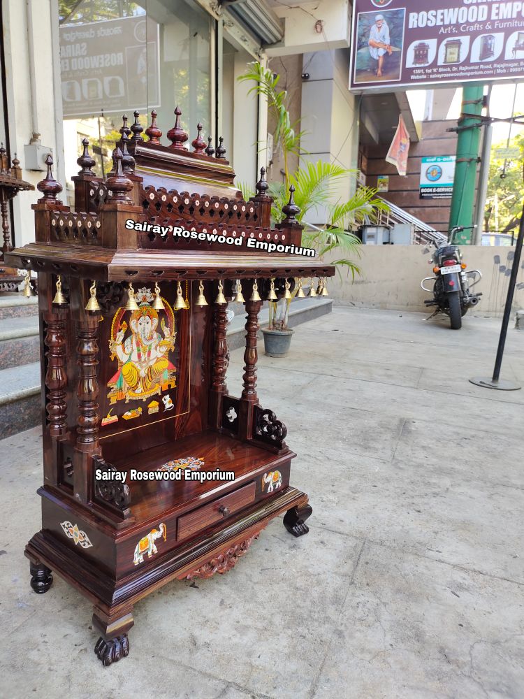 Rosewood Pooja mantapa Depth 15", width 28" height 4 feet readily available at Sairay Rosewood Emporium at wholesale prices, for more details please contact, thank you