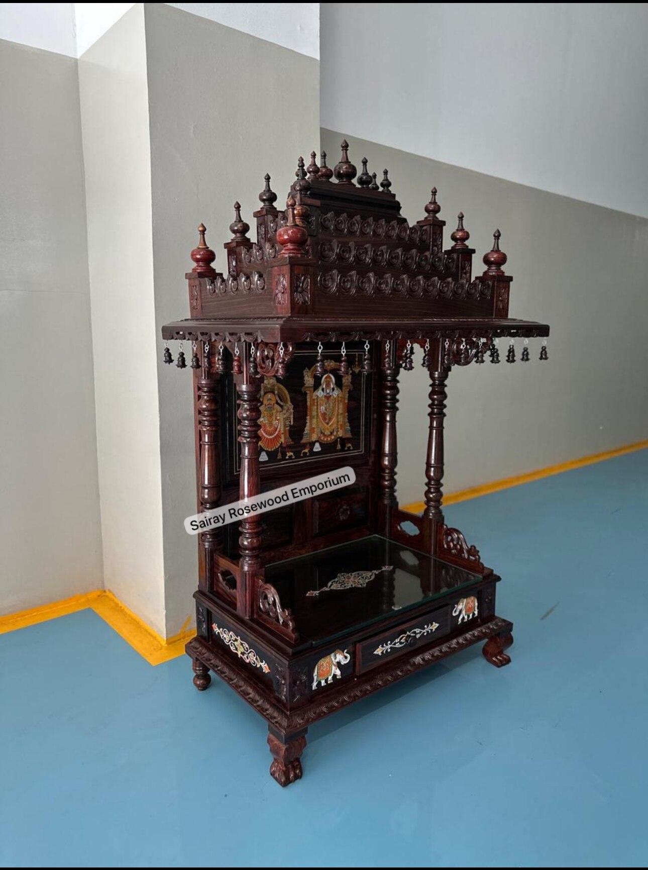 This handcrafted rosewood mandir draws inspiration from South-Indian temple architecture, featuring a tiered roof adorned with finials and miniature brass bells. The sanctum houses revered deities framed in colorful paintings, flanked by turned columns and elevated on a base with intricate scrollwork and elephant motifs. A sanctified space for traditional homes and places of worship, this mandir blends spiritual symbolism with artisanal elegance.